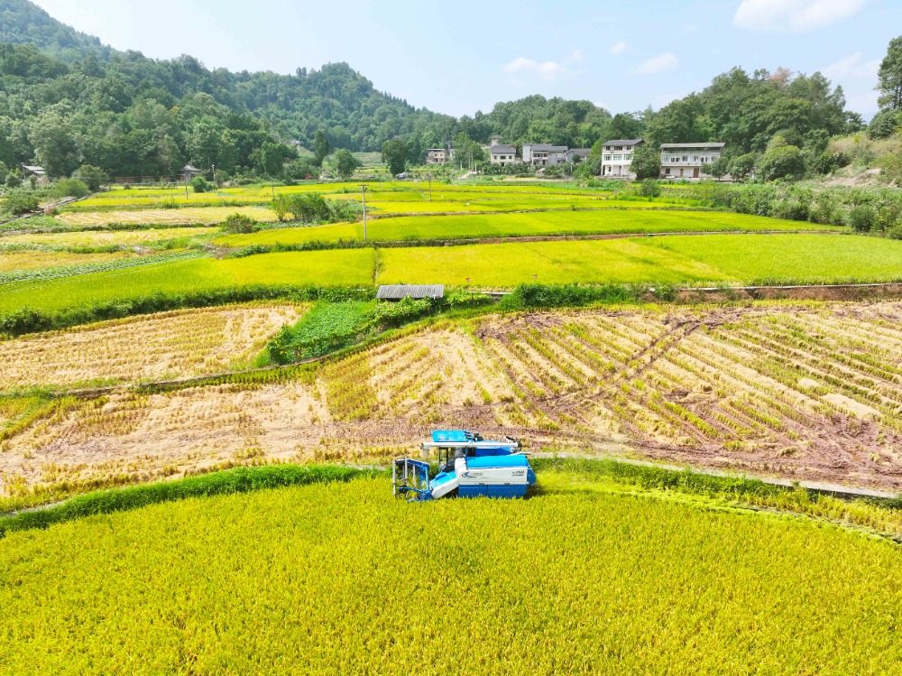 8月7日,巴南区接龙镇马路村,农机手正在收割成熟的水稻。(无人机图片)特约摄影 李攀 通讯员 田春尧 摄