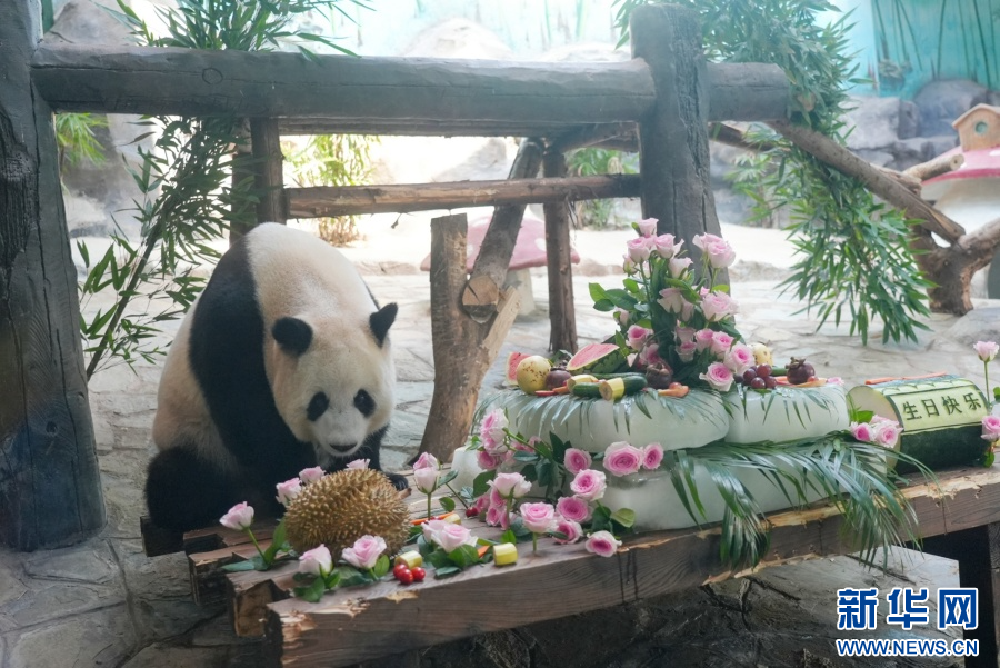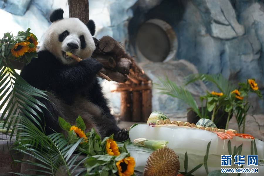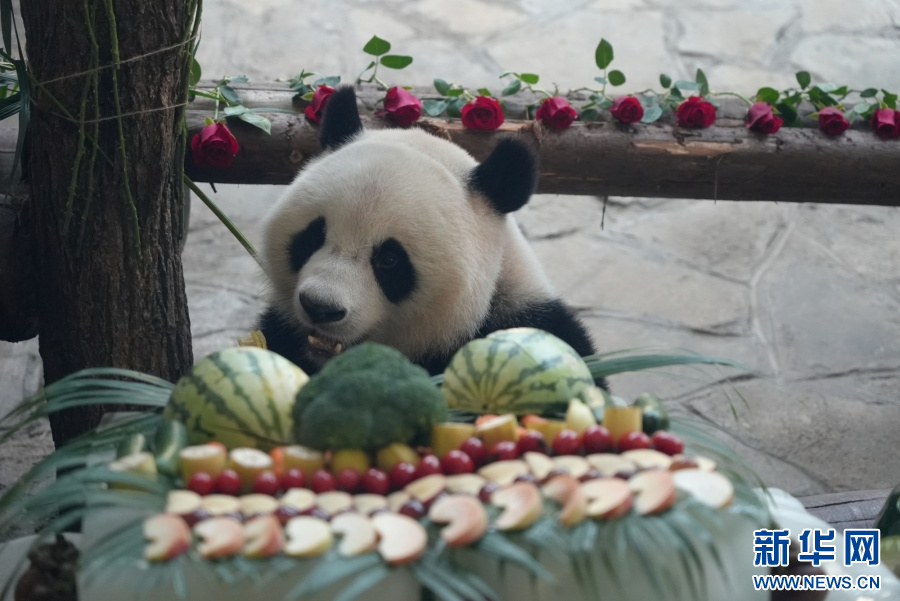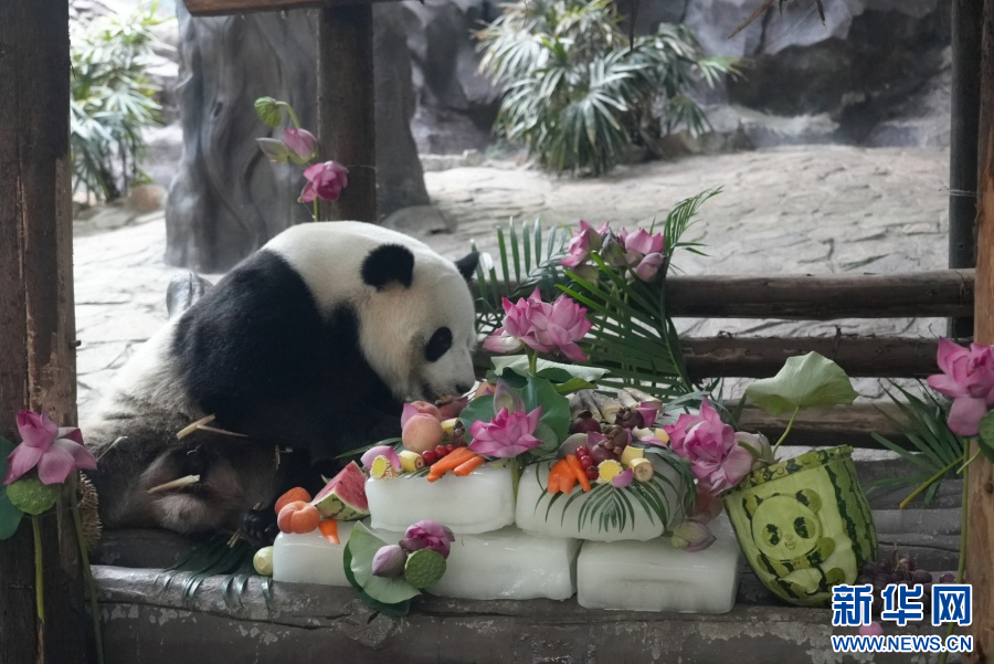 大熊猫爱莲在品尝由多种果蔬和冰块组合而成的“生日蛋糕”。新华网发(王成杰 摄)