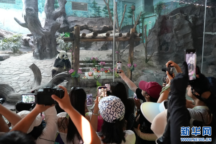 重庆永川乐和乐都动物主题乐园为园区四只大熊猫举办集体生日庆祝活动,吸引众多游客和熊猫粉丝前来分享欢乐。新华网发(王成杰 摄)