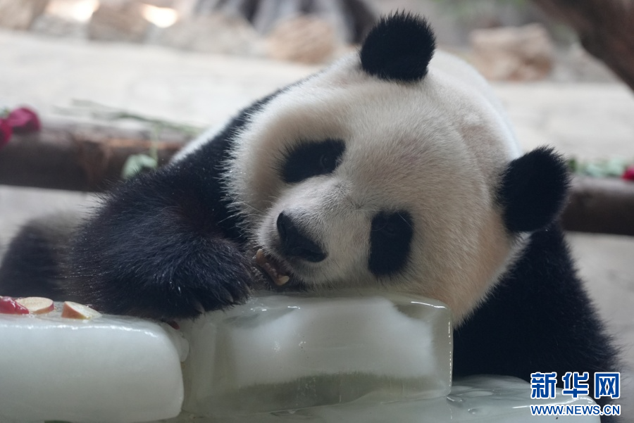 大熊猫青花趴在冰块上消暑。新华网发(王成杰 摄)
