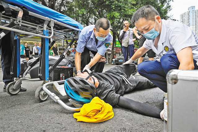 “您有新的急救任务,请尽快出车。”当天下午1点15分,市急救医疗中心医生王凯接到通知,27岁小伙在南岸区突遇车祸,需要立即派车前往救治,他立即与司机景佐武、担架工田寿云组成急救小分队,一路小跑上了救护车。