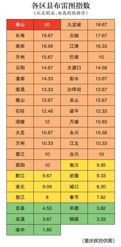 重庆8月1日至3日的监测结果显示,全市平均布雷图指数是11.35,风险等级评估结果为中风险。其中,全市39个区县中,高风险区县(BI≥20,红色)1个;中风险区县(10≤BI<20,橙色)26个;低风险区县(5≤BI<10,黄色)7个;达标区县(BI<5,绿色)5个。