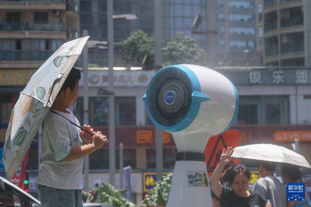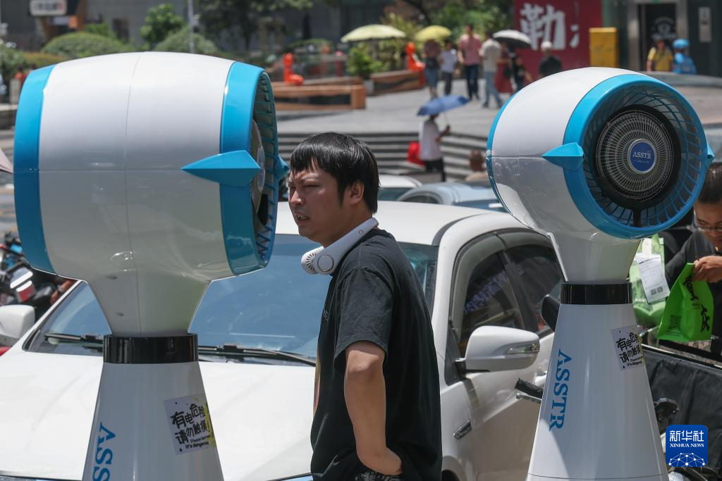 8月2日,重庆市江北区,户外风扇帮助人们降温。新华社记者 陈诚 摄