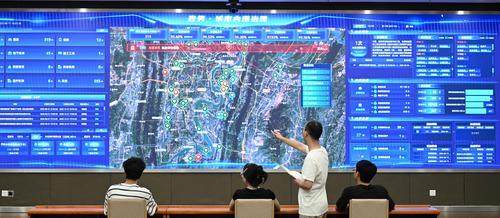 8月10日中午起,重庆西部、东北部及中部部分地区遭遇大雨到暴雨。8月11日下午,记者走进位于市住房城乡建委的城市内涝治理应用驾驶舱内看到,电子大屏实时“直播”着全市内涝防控动态——渝北区双龙湖街道绿梦广场积水告警、下穿道水位变化、易涝点风险提示等信息一目了然。
