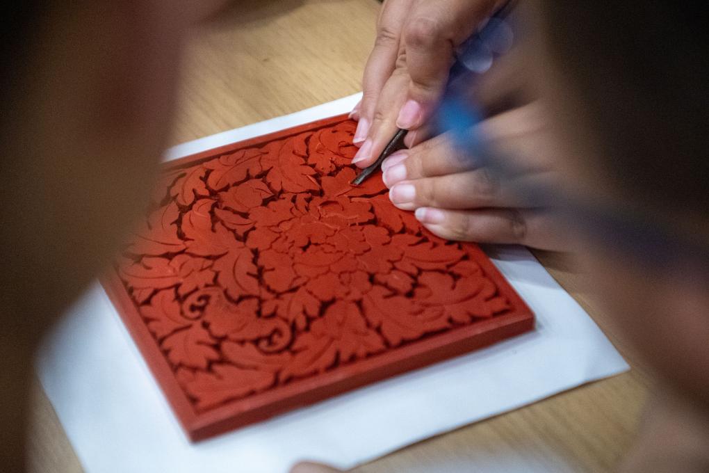 7月31日,在重庆市两江新区大竹林街道竹林社区学院举办的文化艺术游园会活动上,工作人员刘翰音(右一)向小朋友展示雕漆技艺。