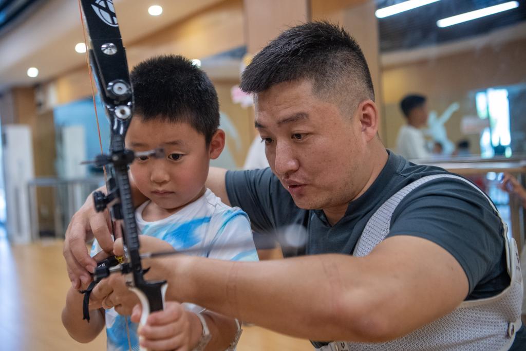 7月31日,在重庆市两江新区大竹林街道竹林社区学院举办的文化艺术游园会活动上,小朋友在工作人员尹占旭(右)的指导下体验射箭。