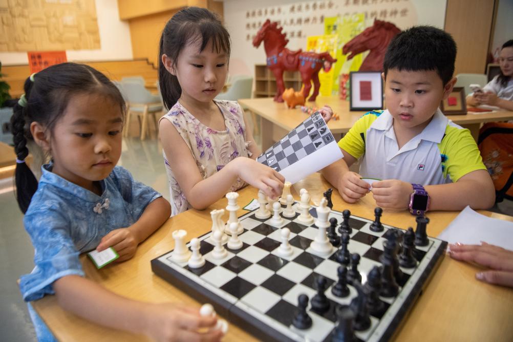 7月31日,小朋友在重庆市两江新区大竹林街道竹林社区学院举办的文化艺术游园会活动上学习国际象棋。