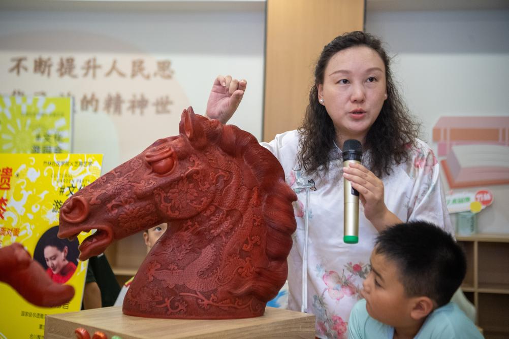 7月31日,在重庆市两江新区大竹林街道竹林社区学院举办的文化艺术游园会活动上,工作人员刘翰音向小朋友和家长介绍雕漆技艺。