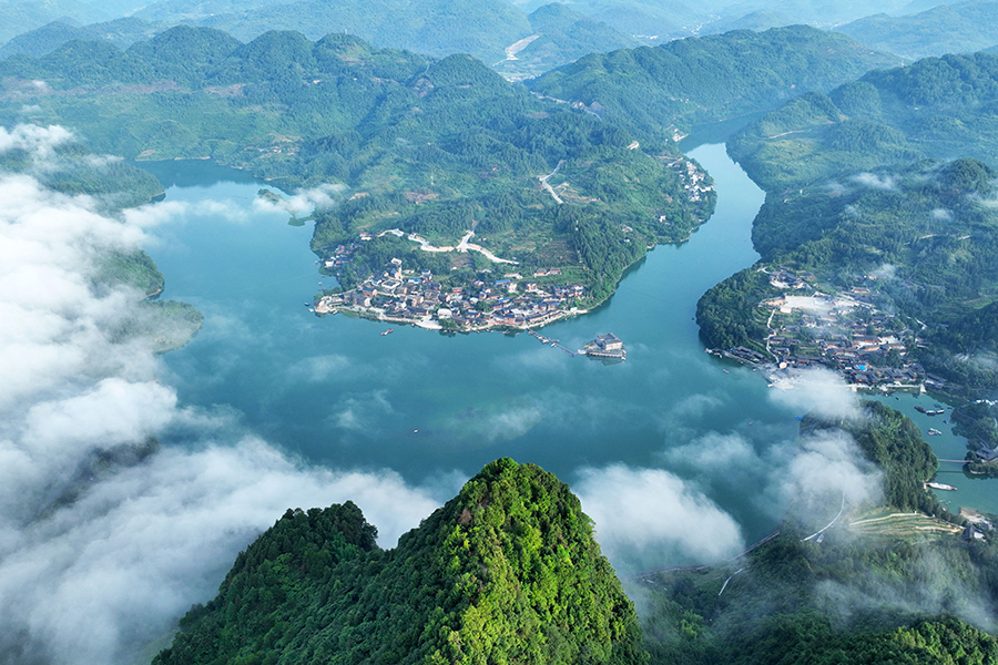 晨雾下的酉水河湾风景如画,两岸青山连绵,河湾处的村庄宁静安详,每个瞬间都充满美好。新华网发(陈碧生 摄)