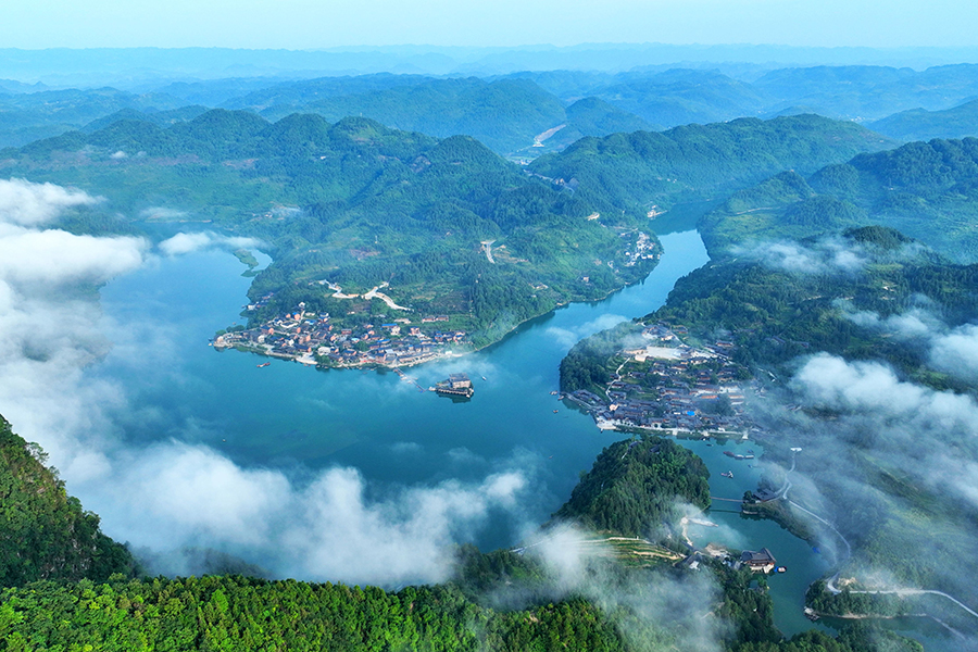 晨雾下的酉水河镇河湾山寨,绿水绕村郭,勾勒出山清水秀的迷人画卷。悠长夏日,位于武陵山区的重庆市酉阳土家族苗族自治县内的乡村青绿盎然,河流、田野、乡村,处处弥漫着一股夏日乡村特有的和谐与宁静,风景如诗。新华网发(陈碧生 摄)