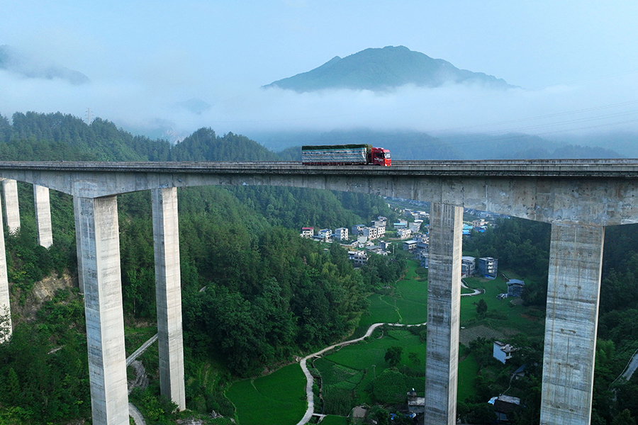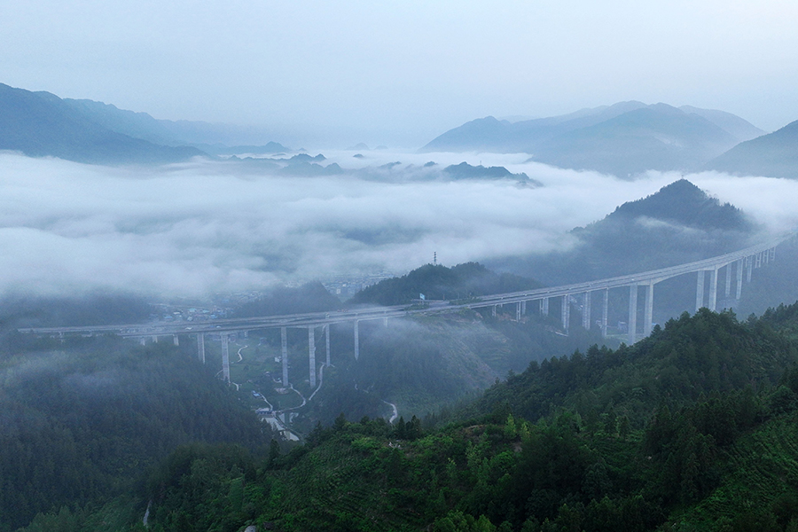 夏日雨后,铜鼓镇酉(酉阳)沿(沿河)高速公路云雾缭绕,行驶在这段高速路上的车辆如同在画中穿行。新华网发(陈碧生 摄)