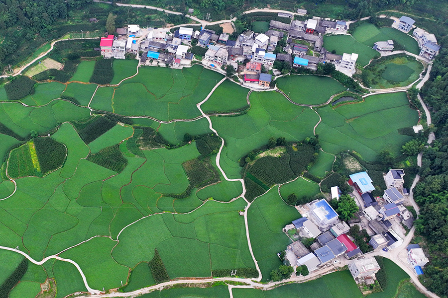 在酉阳县李溪镇让坪村,这里的高标准农田与错落有致的民居、蜿蜒的道路相映成景,满目翠绿的田野生机勃勃。新华网发(陈碧生 摄)