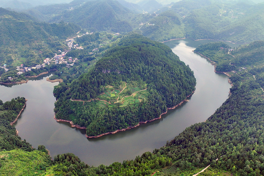 盛夏时节,酉阳县金家坝水库小雨初歇,水面如镜,绿树成荫。公路穿过水库,在湖面勾勒出一条美丽的曲线。新华网发(陈碧生 摄)