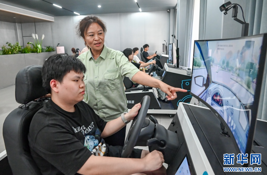 工作人员正在指导学员模拟驾驶。新华网发(付作侨 摄)