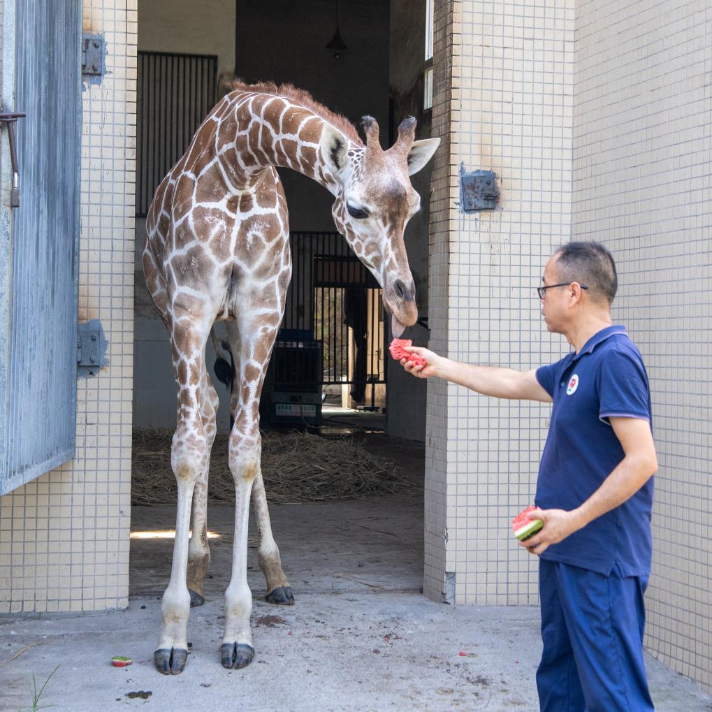 7月16日,饲养员在重庆动物园给长颈鹿喂食冰镇西瓜。新华社记者 唐奕 摄
