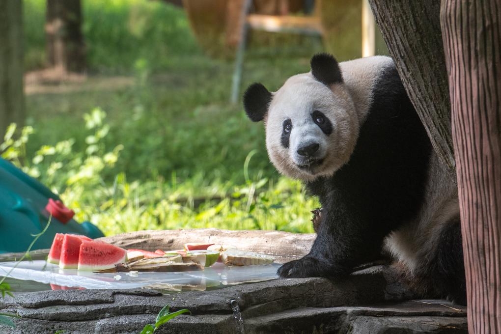 7月16日,大熊猫在重庆动物园吃冰镇水果。
