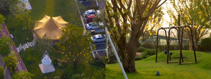 以万科璞园为例,项目南侧规划约6000平方米社区交互营地,构建邻里共生平台;主动退让城市道路红线,利用街角空间打造开放式公共公园。公园内设置全龄友好设施:儿童活动区依托微地形设计,结合秋千、沙坑等激发童趣探索;露营基地配备多样化帐篷及休憩设施,形成区域级社交生活中心,为亲子互动、社群活动提供自然空间。