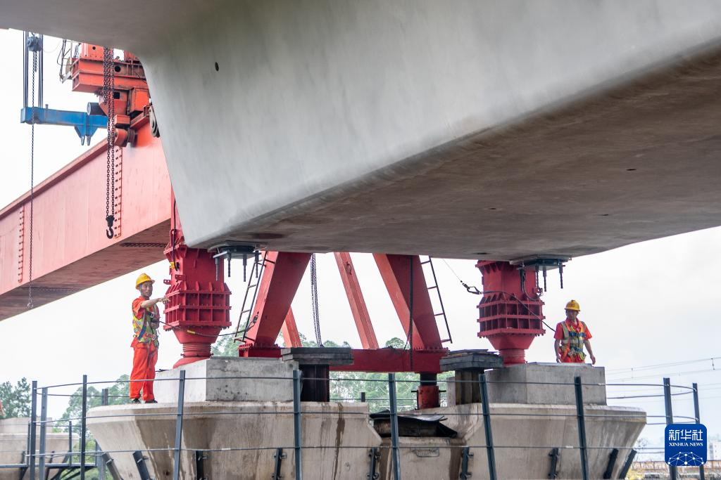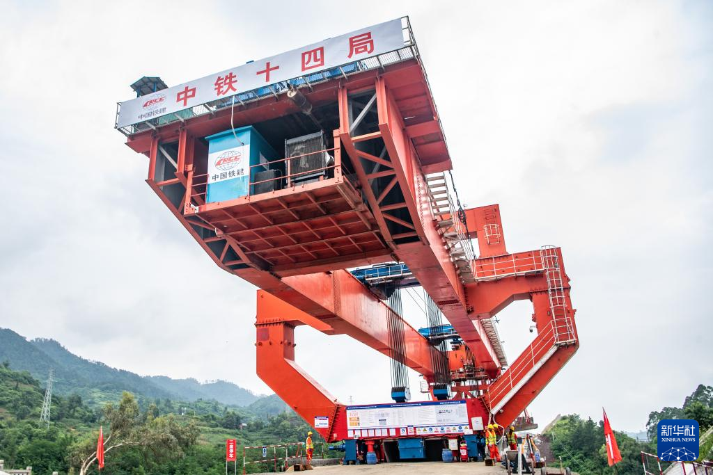 7月10日,在西渝高铁陈家沟特大桥建设现场,架梁机在工人的指挥下进行首孔箱梁架设作业。新华社记者 唐奕 摄