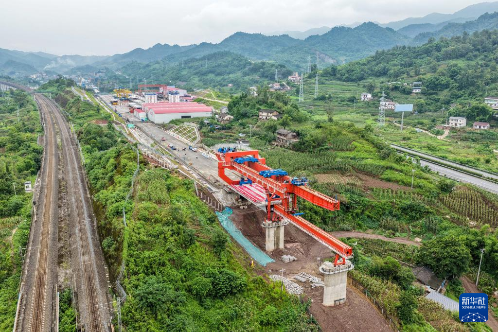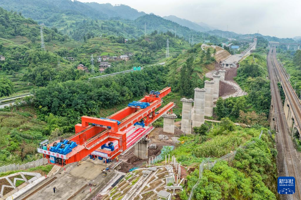 7月10日,在西渝高铁陈家沟特大桥建设现场,架梁机在进行首孔箱梁架设作业。新华社记者 唐奕 摄