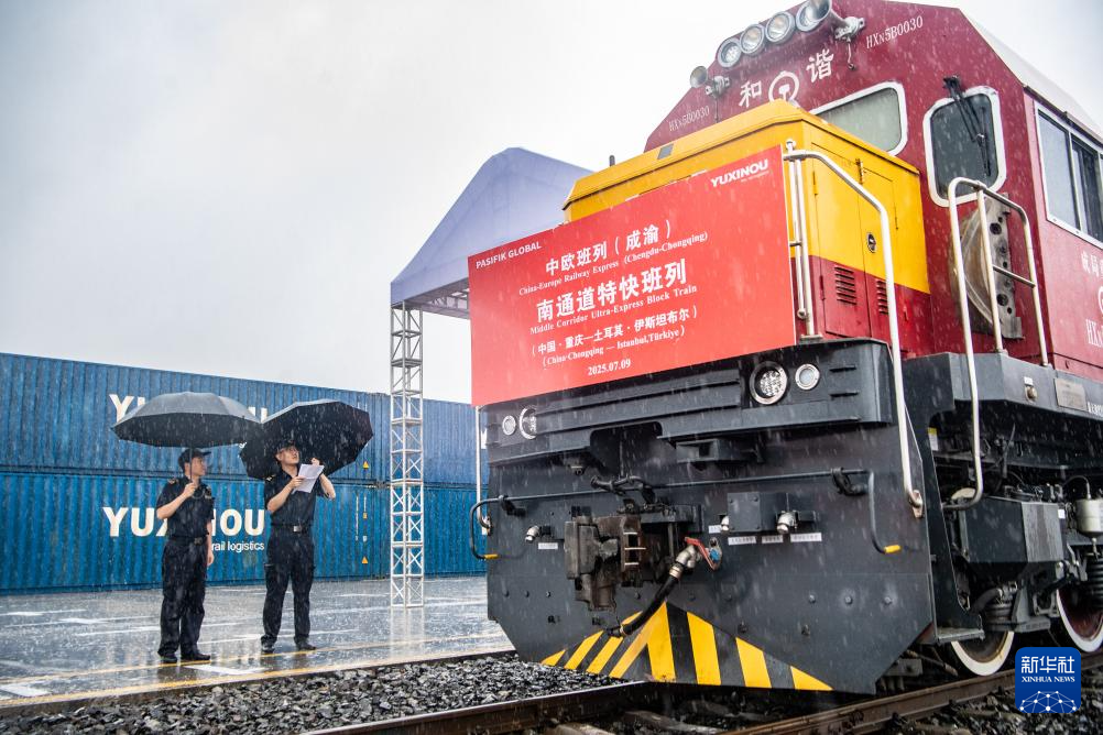 7月9日,中欧班列(成渝)南通道特快班列在重庆团结村中心站等候发车。新华社记者 唐奕 摄