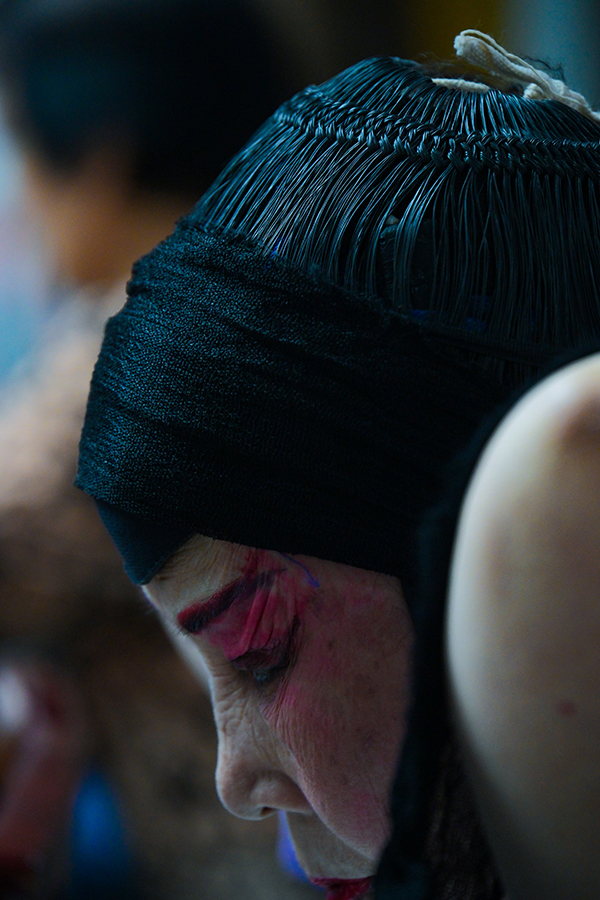 一位演员在表演前进行化妆准备。如今,水土老街不再熙熙攘攘,剧团里的演员也大多年过古稀,但熟悉的锣鼓声依然会在每月准时响起,成为老街居民心中最深的牵挂。新华网发(汪彦彤 摄)