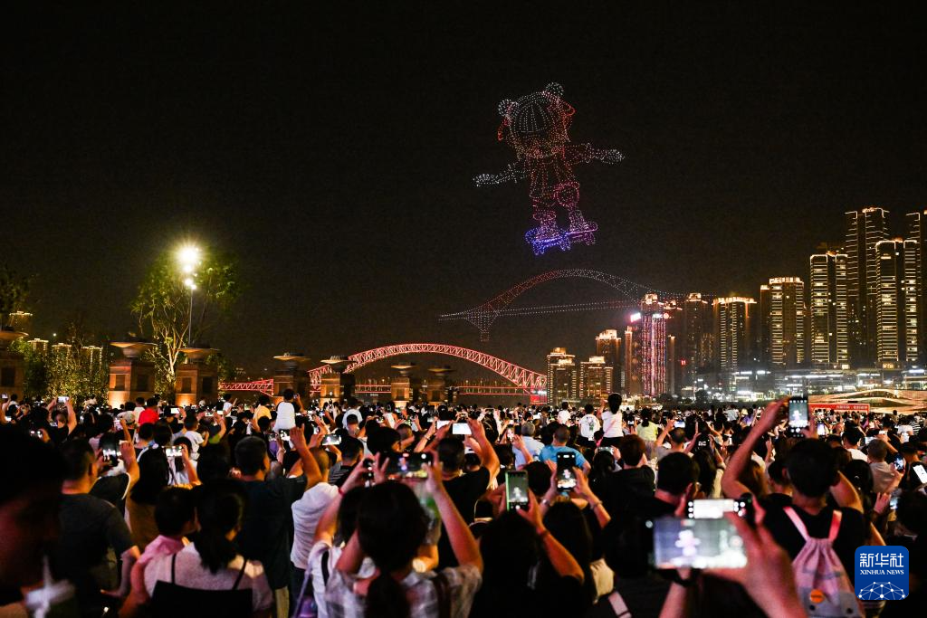 5月2日晚,游客在重庆朝天门广场观看无人机灯光秀。新华社记者 王全超 摄