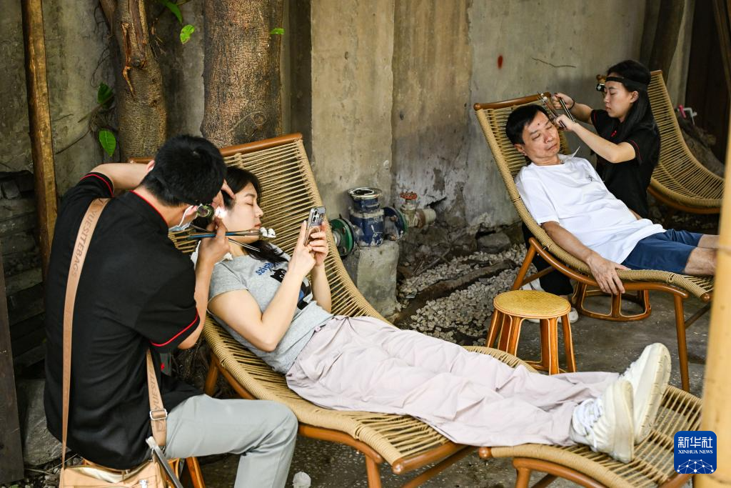 6月8日,游客在重庆市渝中区山城巷体验采耳服务。新华社记者 王全超 摄