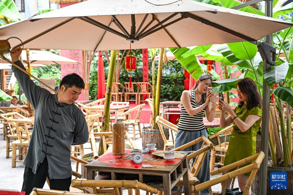 6月8日,在重庆市渝中区山城巷的一家露天茶馆,茶艺表演者与游客互动。新华社记者 王全超 摄