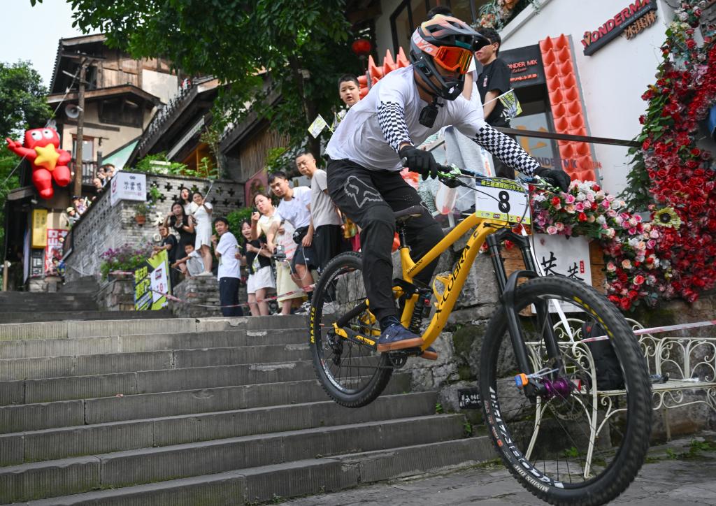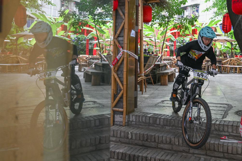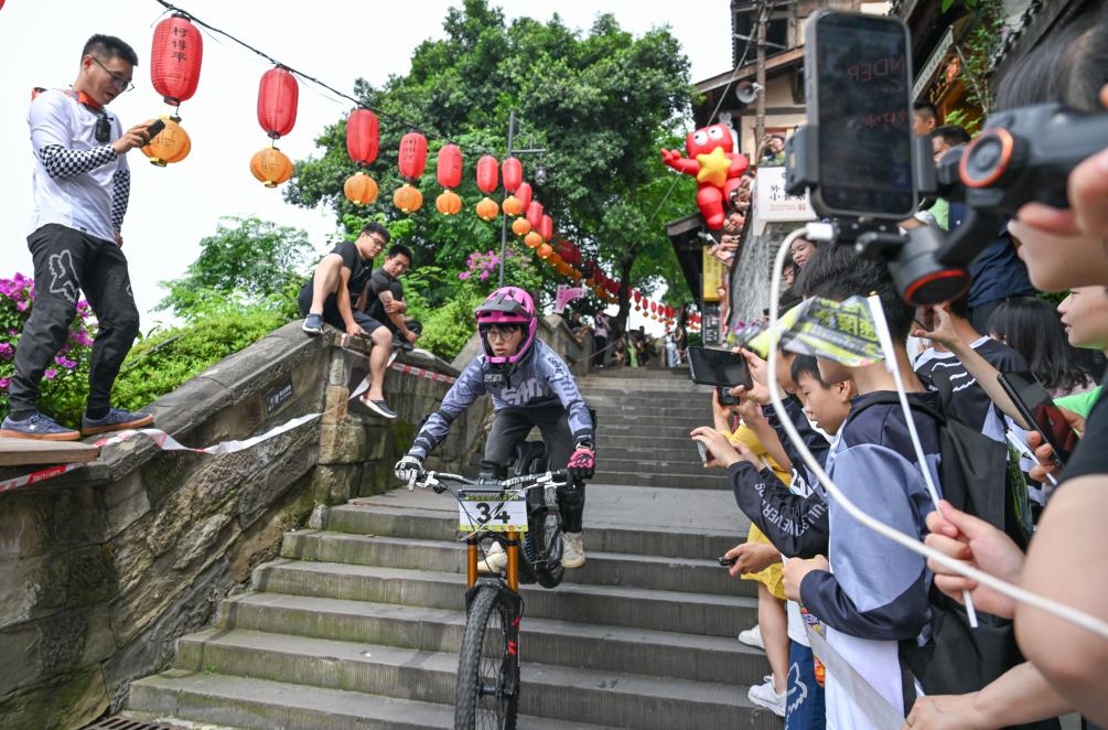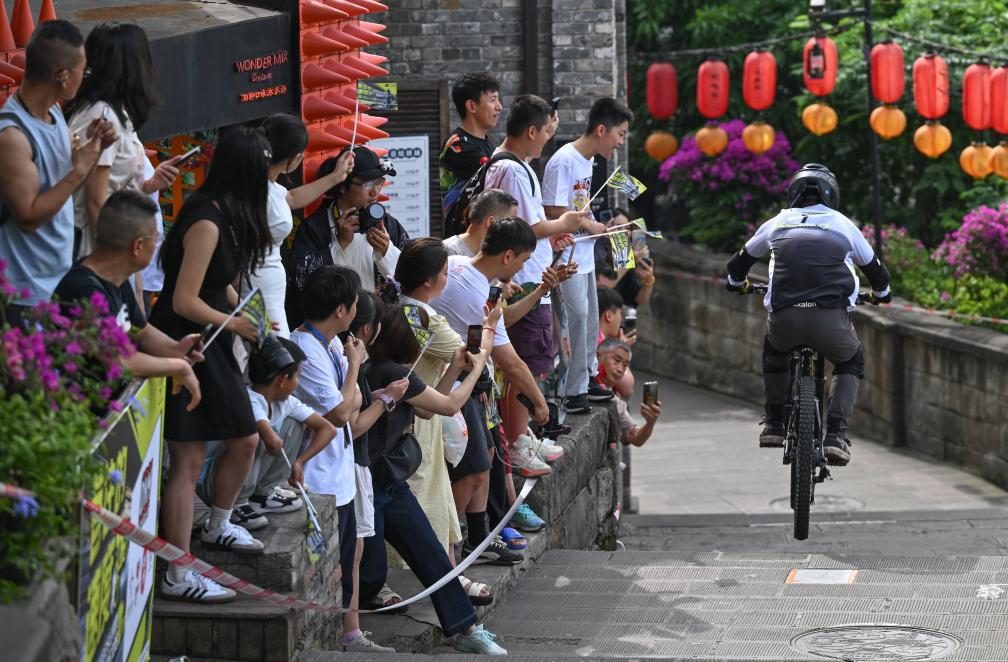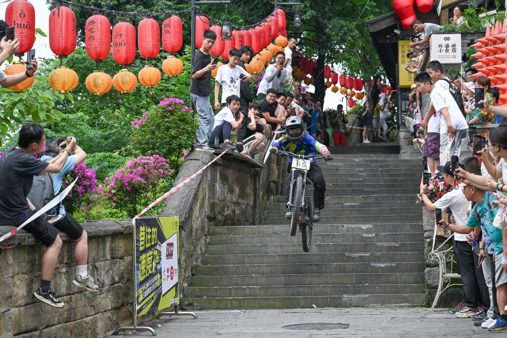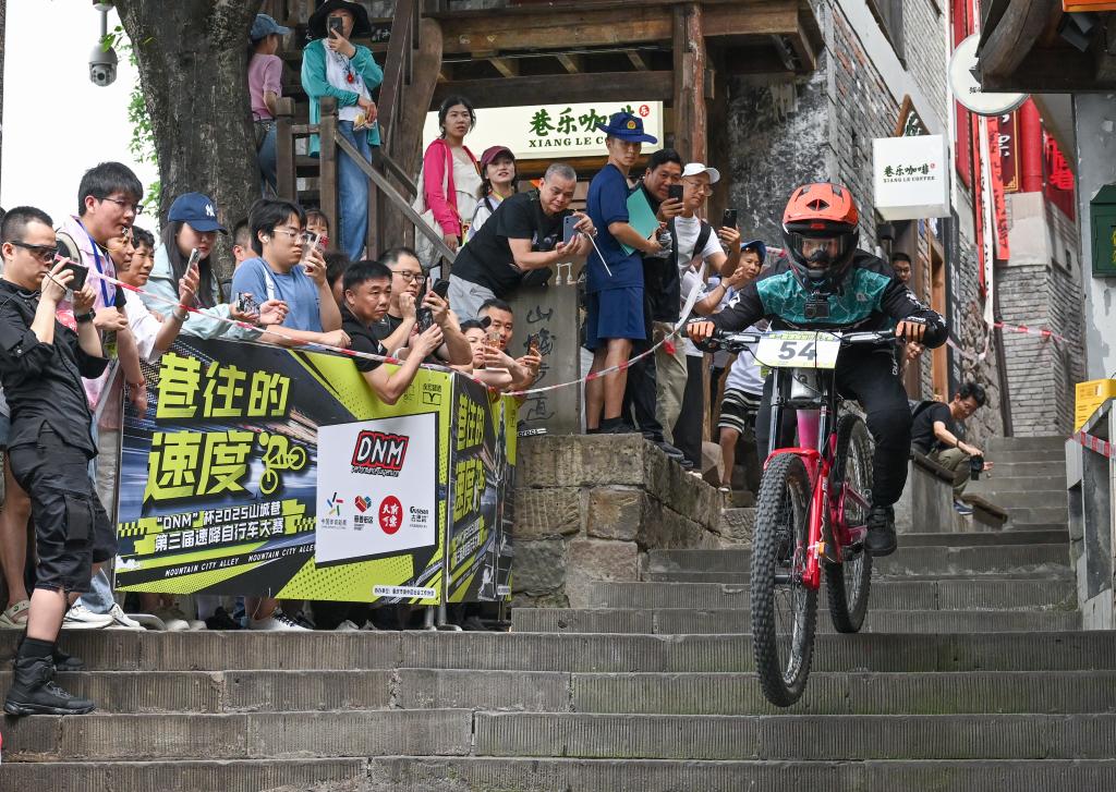 当日,2025山城巷第三届速降自行车大赛在重庆市渝中区山城巷举行。65名来自重庆、四川、广东、浙江等地的自行车速降选手齐聚重庆,在长度400多米的山城巷老街赛道上展开激烈角逐。