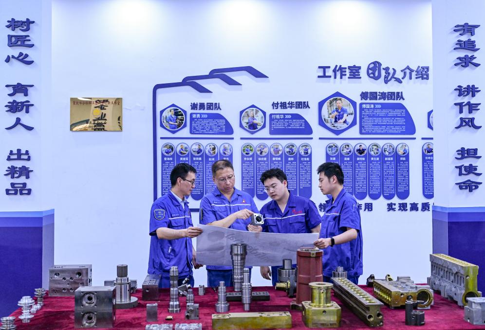 5月23日,傅国涛(左二)在重庆红江机械有限责任公司技能大师工作室与同事交流。