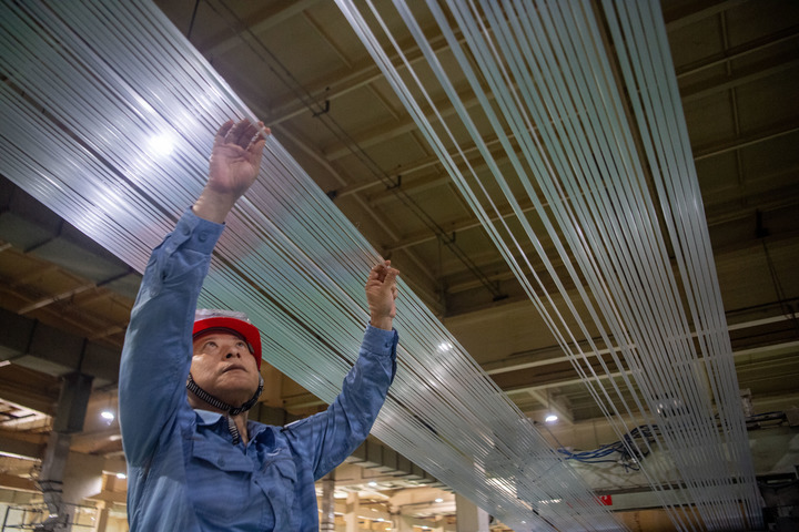 5月23日,中国石化集团重庆川维化工有限公司工作人员在生产线上检查高强高模纤维产品生产情况。