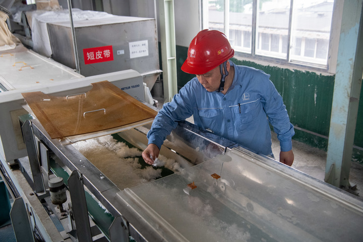 5月23日,中国石化集团重庆川维化工有限公司工作人员在检查高强高模纤维产品包装情况。