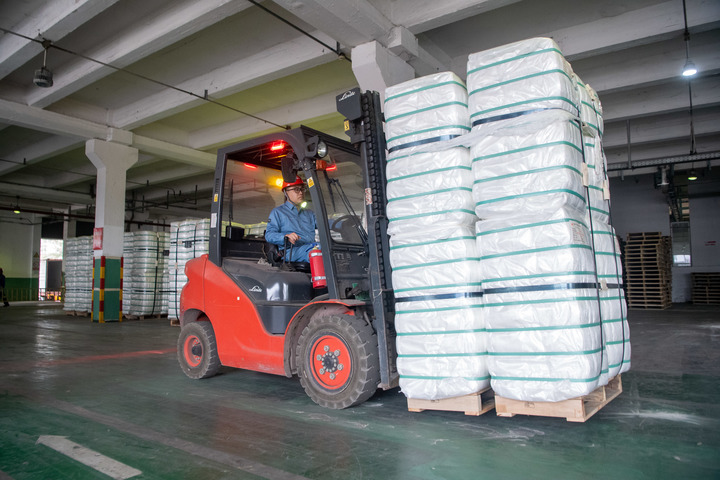 5月23日,中国石化集团重庆川维化工有限公司工作人员在转运高强高模纤维产品。