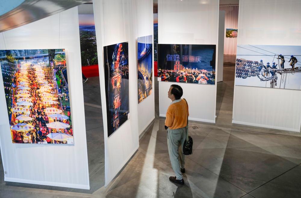 7月18日,"拥抱特高压·光耀新重庆"主题摄影展展厅内,摄影爱好者在观看精美的电力主题摄影作品。