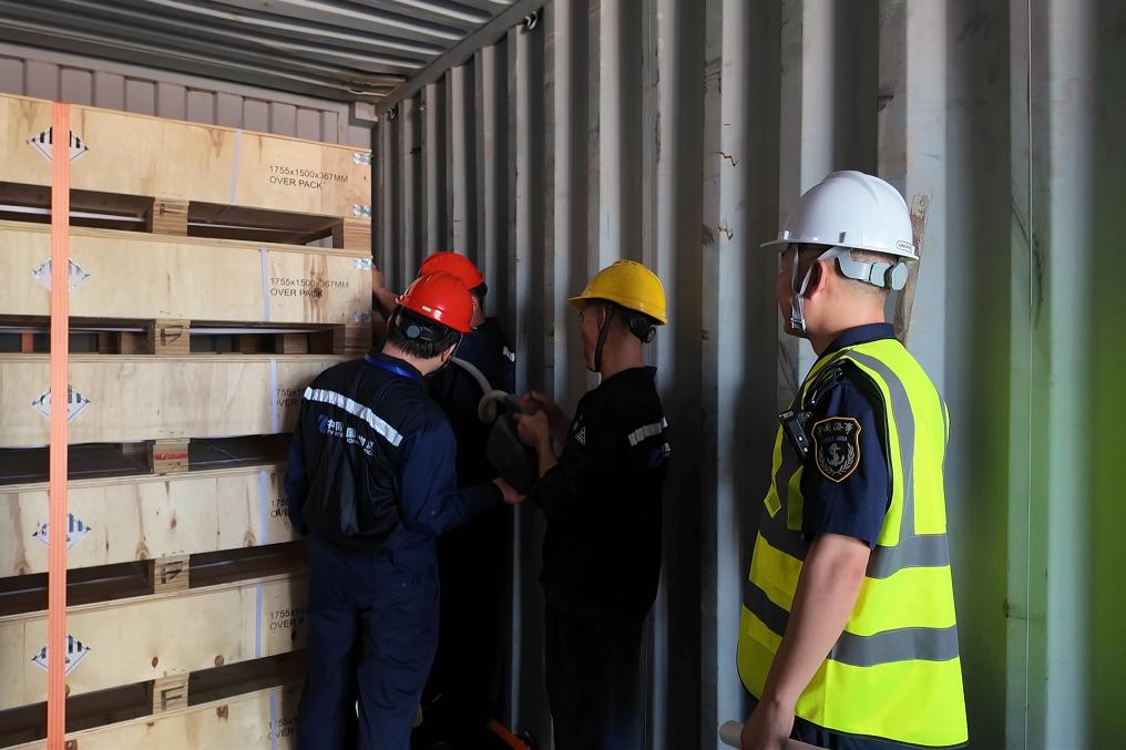 图为重庆海事局执法人员在查验锂离子电池货物装箱情况。