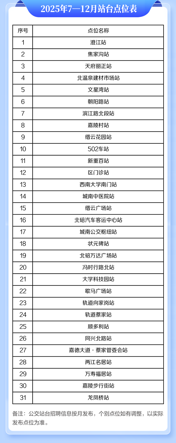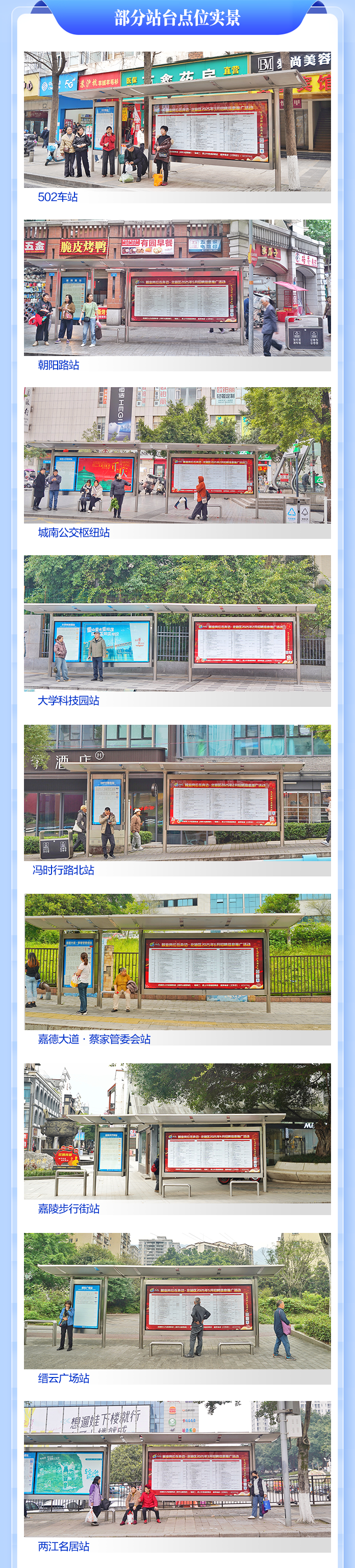 北碚区人力社保局有关负责人介绍,此举源于疫情期间为解决企业用工问题的临时举措。今年以来,为服务保障企业用工、方便劳动者求职就业,该区将过去利用公交站牌发布招聘信息的不定期措施,创新固化为“公交站牌+就业”的常态化行动,在重点区域31块公交站牌上免费滚动发布企业用工信息,每月更新两次,涵盖从普工到技术员的各类岗位。
