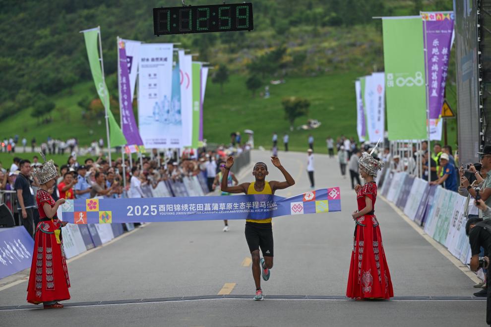 6日,埃塞俄比亚选手阿雷德·内加什·海鲁斩获男子组冠军,图为冲线瞬间。
