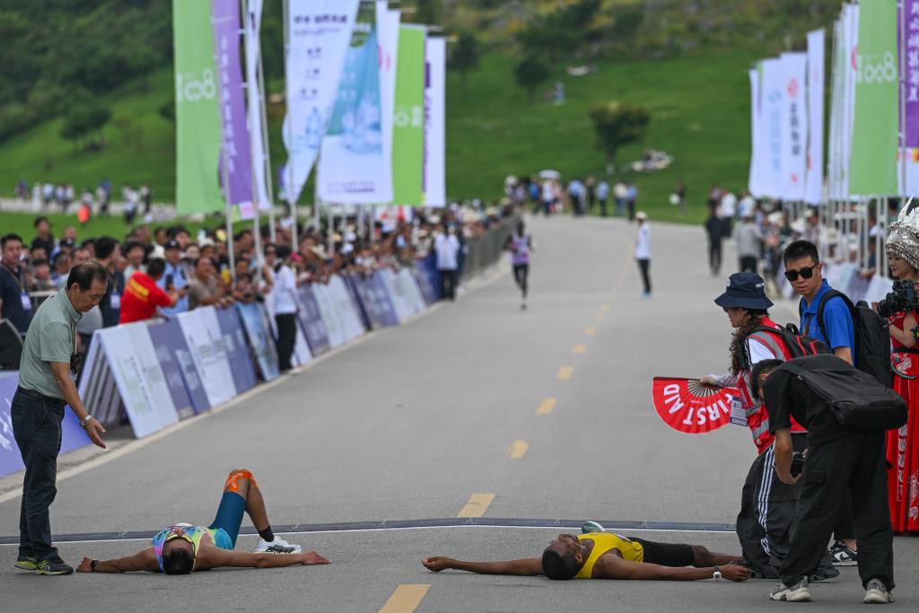 6日,埃塞俄比亚选手阿雷德·内加什·海鲁(右)、中国选手许汝安在冲过终点线后躺地上休息。