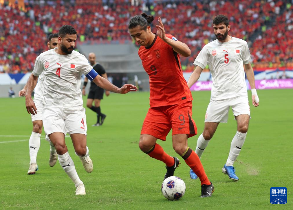 6月10日,刘诚宇(左)在比赛中防守巴林队球员阿明·本阿迪。新华社记者 胡星宇 摄