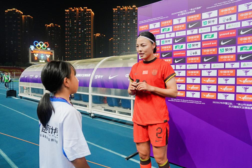 提问的女孩叫蔺文婧,来自重庆石柱三河镇小学女子足球队。在8日举行的永川国际女足锦标赛决赛中,中国队5:1击败泰国队夺冠。蔺文婧作为赛事特邀小记者,在赛后混采环节获得提问机会。