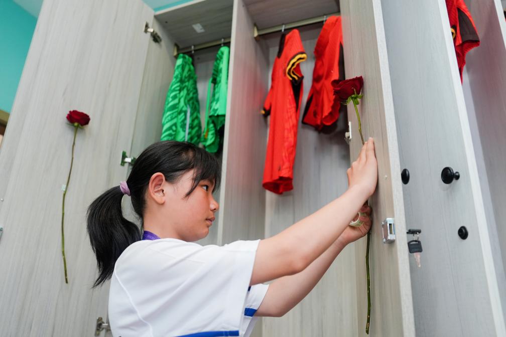 三河镇小学女足队员在更衣室为中国女足队员准备玫瑰花