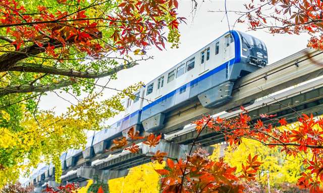 南岸区学府大道,轨道3号线列车飞驰而过,红色枫叶与黄色银杏交织成一幅绚烂的画卷。(资料图片)特约摄影 郭旭/视觉重庆